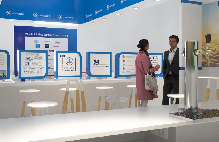 Proyecto para la Correduría de Seguros INTERMUNDIAL en el salón internacional del turismo FITUR 2020. La distribución está estructurada en zonas bien diferenciadas; área de recepción, área comercial, zona de bar, sala de reunión y área para almacén y guardarropa.…